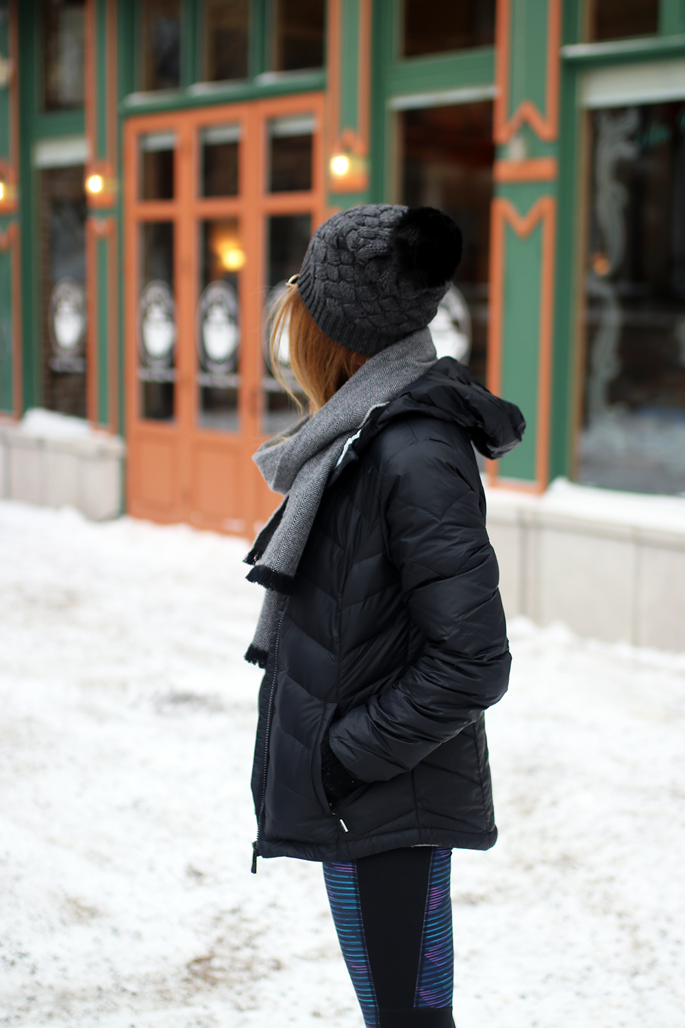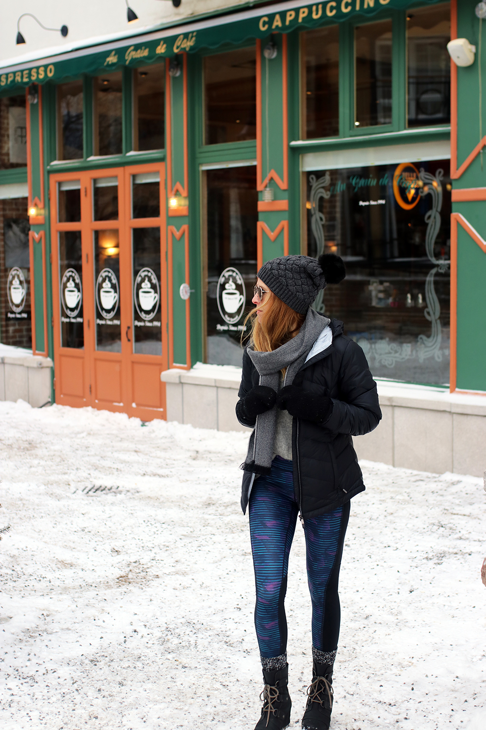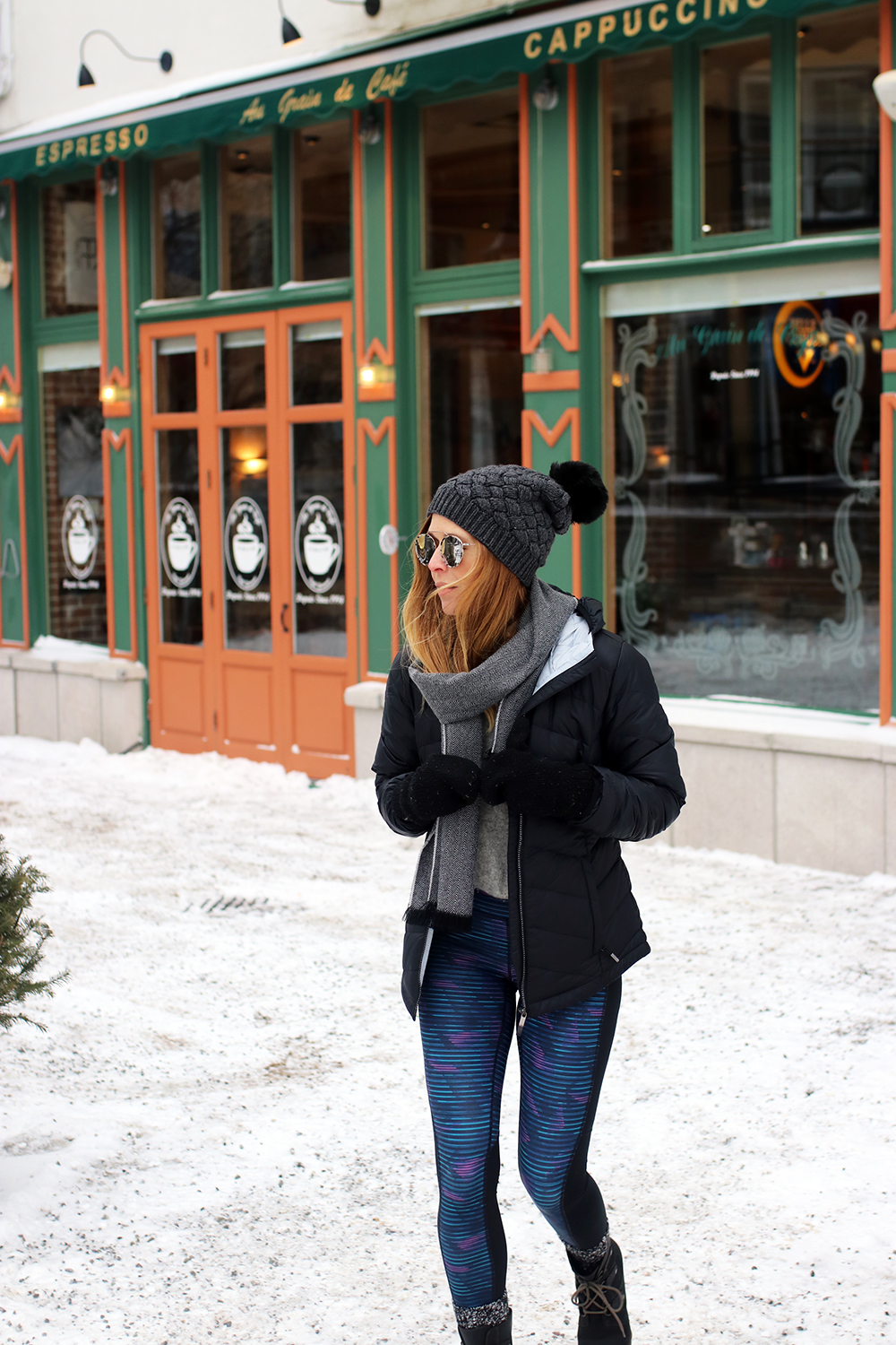 OUTFIT DETAILS: J.Crew Hat (sold out, similar to this one in USA, in CAD) | Illesteva Wynwood II Sunglasses (this exact same colour combo sold out, but here’s this one also by them and suuuper similar) | J.Crew Scarf (sold out, similar to this one in USA, in CAD) | Gifted Lole Emeline Packable Jacket (on sale! Canadians click here) | Aritzia Sweater (similar to this one) | Gifted Lole Tights (similar to these in USA, in CAD) | J.Crew socks (like these in USA, click here in Canada) | Sorel Joan of Arctic Wedge Booties (with shearling lining here and here).
