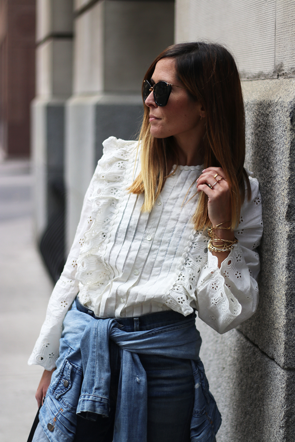 WEARING: Miu Miu Sunglasses (great deal) | J.Crew Floral Eyelet Blouse (on sale!) | J.Crew Denim Jacket | Citizens of Humanity Rocket Hi Lo Hem Rise Jeans (similar but straight style, similar wash and style without the hi-lo hem) | Rebecca Minkoff Unlined Medium Tote (such a good tote for traveling!) | Old J.Crew Leopard Flats (similar, similar, similar)