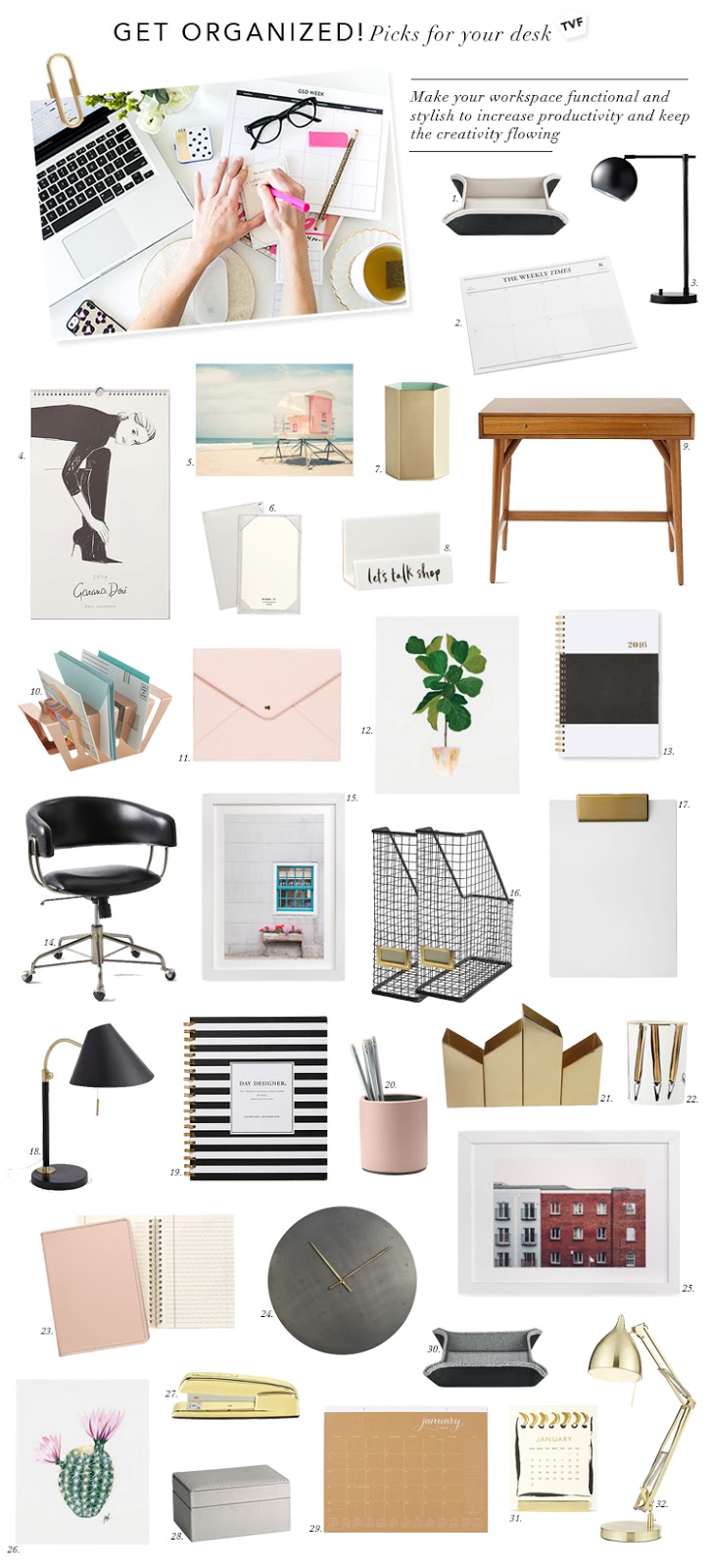 1. Graphic Image Leather Catchall | 2. CB2 Weekly Times Desk Notepad Calendar | 3. Treshold Brass Task Lamp | 4. Garance Dore Studio Les Femmes 2016 Calendar | 5. Tower 4 Photography Print | 6. Graphic Image Jotter | 7. CB2 Pilar Pencil Cup | 8. Kate Spade Business Card Holder | 9. West Elm Mid-Century Mini Desk | 10. CB2 Rose Gold Letter Holder | 11. Sugar Paper Document Holder | 12. Fiddle Leaf Fig Print | 13. Sugar Paper Planner | 14. West Elm Halifax Leather Office Chair | 15. Alexandra Feo A Little Window Print | 16. Treshold Rustic Wire Magazine Hodler | 17. Nate Berkus x Target Clipboard | 18. West Elm Mid-Century Task Table Lamp | 19. Day Designer 2016 Planner | 20. Graphic Image Pencil Cup | 21. Nate Berkus x Target Desktop Organizer | 22. Kate Spade Daisy Place Pencil Cup | 23. Graphic Image Notebook | 24. CB2 Iron Circle Wall Clock | 25. Monday Project Windows of Dublin Print | 26. Flowering Cacti Print | 27. Nate Berkus x Target Stapler | 28. Graphic Image Small Box | 29. Sugar Paper 2016 Desk Pad | 30. Graphic Image Leather Catchall | 31. Kate Spade Desktop Calendar | 32. CB2 Brass Carpenter Table Lamp