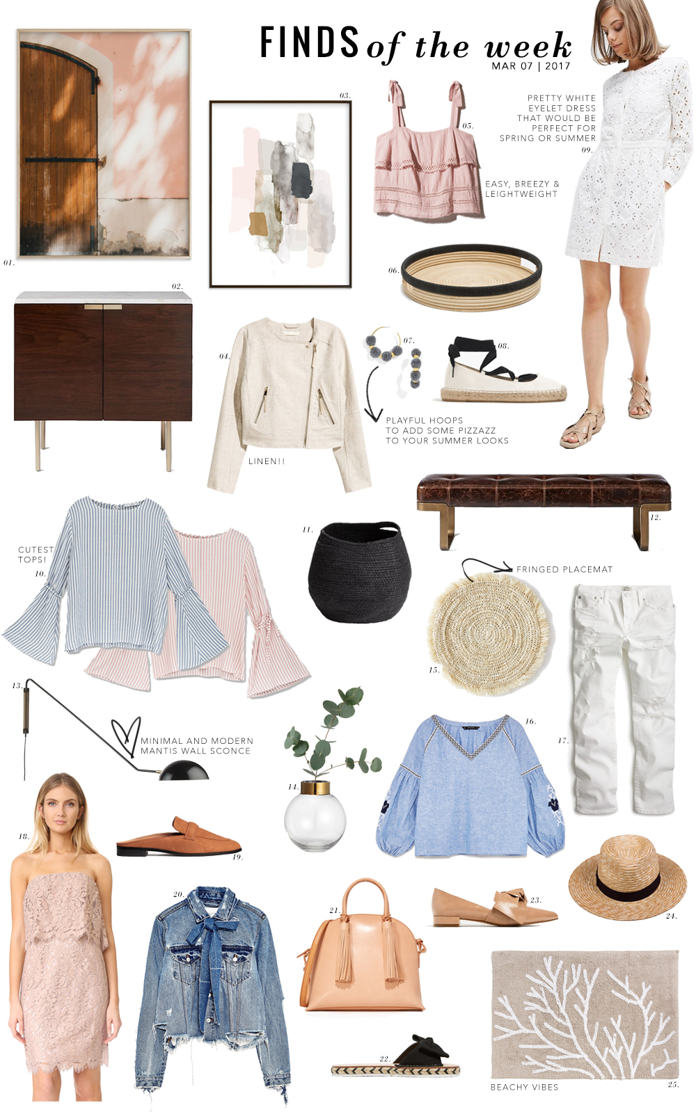 1. Limited Edition Art Print by Lindsay Ferraris Photography | 2. West Elm Delphine Entryway Console | 3. Mixed Media Limited Edition Art Print by Melanie Severin | 4. H&M Linen-Blend Biker Jacket | 5. Wilfred Avenelle Blouse | 6. Zara Home Round Tray | 7. BaubleBar Havana Pom Pom Earrings | 8. J.Crew Lace-up Espadrilles | 9. Vanessa Bruno Dress | 10. Pull & Bear Striped Fluted Sleeve Top | 11. H&M Jute Storage Basket | 12. West Elm Ziggy leather bench | 13. CB2 Mantis Wall Sconce | 14. H&M Large Glass Vase | 15. Zara Home Fringed Placemat | 16. Zara Embroidered Blouse | 17. J.Crew Vintage Cropped Destroyed Jeans | 18. BB Dakota Sakura Strapless Lace Dress | 19. H&M Backless Loafers | 20. Zara Denim Jacket with Bow | 21. Loeffler Randall Dome Stachel | 22. Kate Spade Idalah Slides | 23. Zara Flats | 24. Lack of Color The Spencer Fedora | 25. Zara Home Cotton Bath Mat