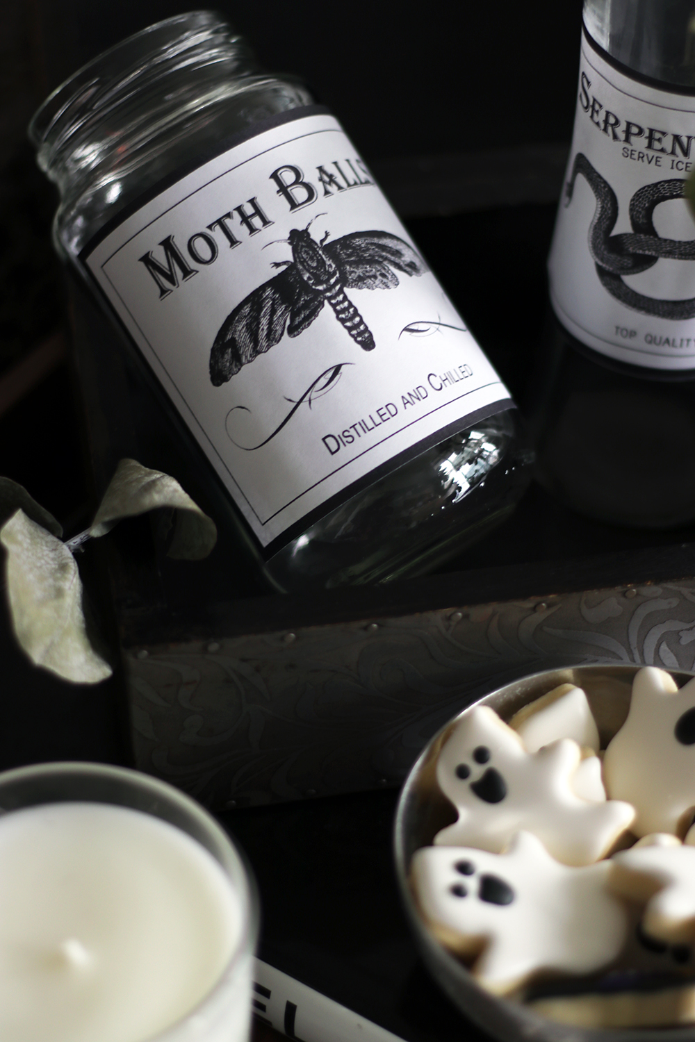 Then I found these labels which are great to wrap around bottles for drinks. I love that they look kind of minimal and spooky-chic. You could also spray paint old bottles in black and stick these to them and use as vases, just an idea!