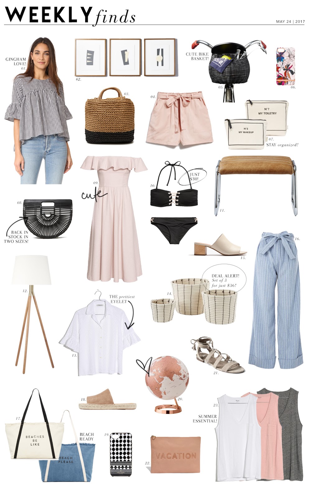 1. Amanda Uprichard Imogen Top | 2. CB2 Shape up Collage Set | 3. Need Supply Equator Tote | 4. Farrow Bolsa Shorts in Dusty Pink | 5. CB2 Bike Basket | 6. Richmond and Finch iPhone Case | 7. Bag-All Makeup Travel Pouch  and Bag-All Toiletry Travel Pouch | 8. Cult Gaia Small Ark in Black (large here) | 9. H&M Off-the-Shoulder Dress | 10. H&M Bikini Top and Bottom | 11. CB2 Terreno Leather Ottoman | 12. CB2 Tres Floor Lamp | 13. Madewell Eyelet Bell-Sleeve Shirt | 14. White Basket Set | 15. Madewell The Devon Mule Sandal | 16. Topshop Wide Leg Striped Trousers | 17. Milly Canvas Tote and Milly Denim Tote | 18. Matt Bernson Palma Suede Espadrille Slides | 19. Kate Spade iPhone Case | 20. Atmosphere® Ligheted Globe in Copper | 21. Gap Gladiator Suede Sandals | 22. Madewell Oversized Leather Pouch | 23. Madewell Whisper Cotton V-Neck Tanks